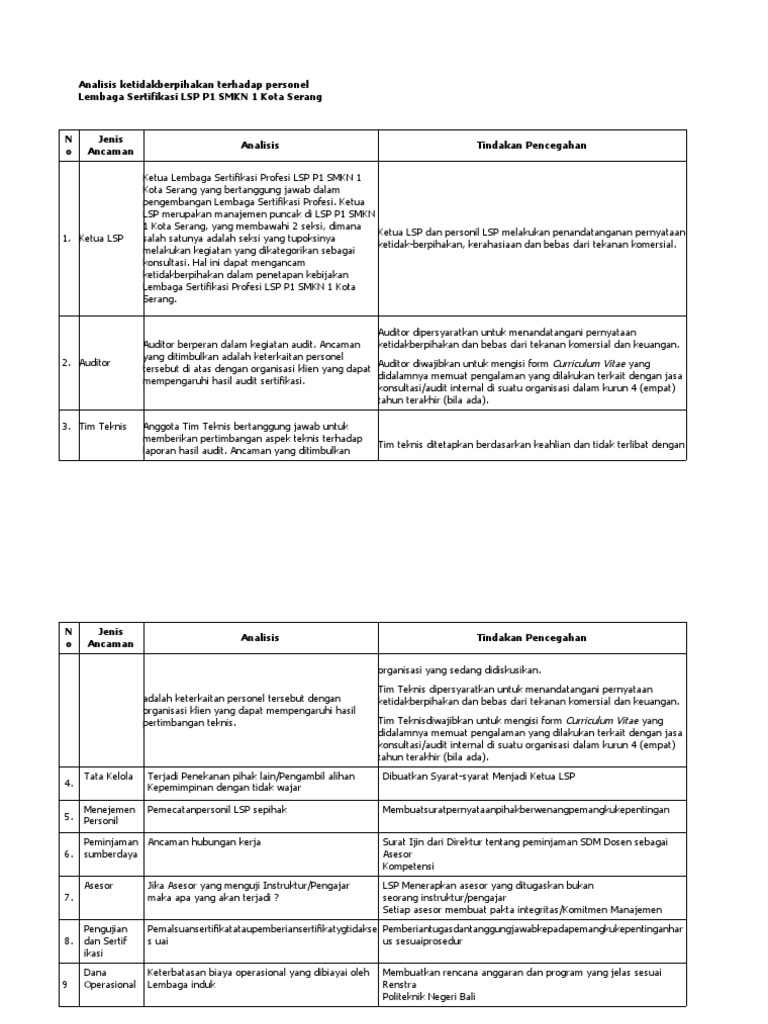 Melakukan Analisis Ketidakberpihakan Instruksi Kerja. L S P S M K N E G E R I 1 B U M I J AWA KABUPATEN TEGAL Jl. The results show that the man factor is the critical point that causes the threat to impartiality and the implementation of impartiality management at LSP BATAN has achieved.